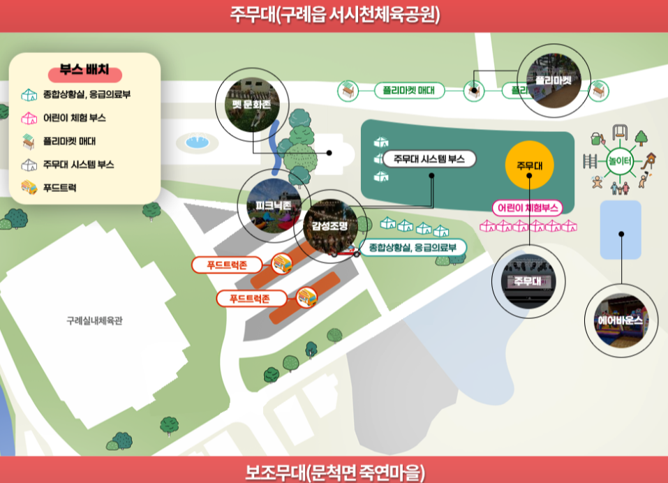 - 서시천체육공원 → 메인무대 공연 관람 → 푸드트럭 존 → 비눗방울 놀이 → 포토존